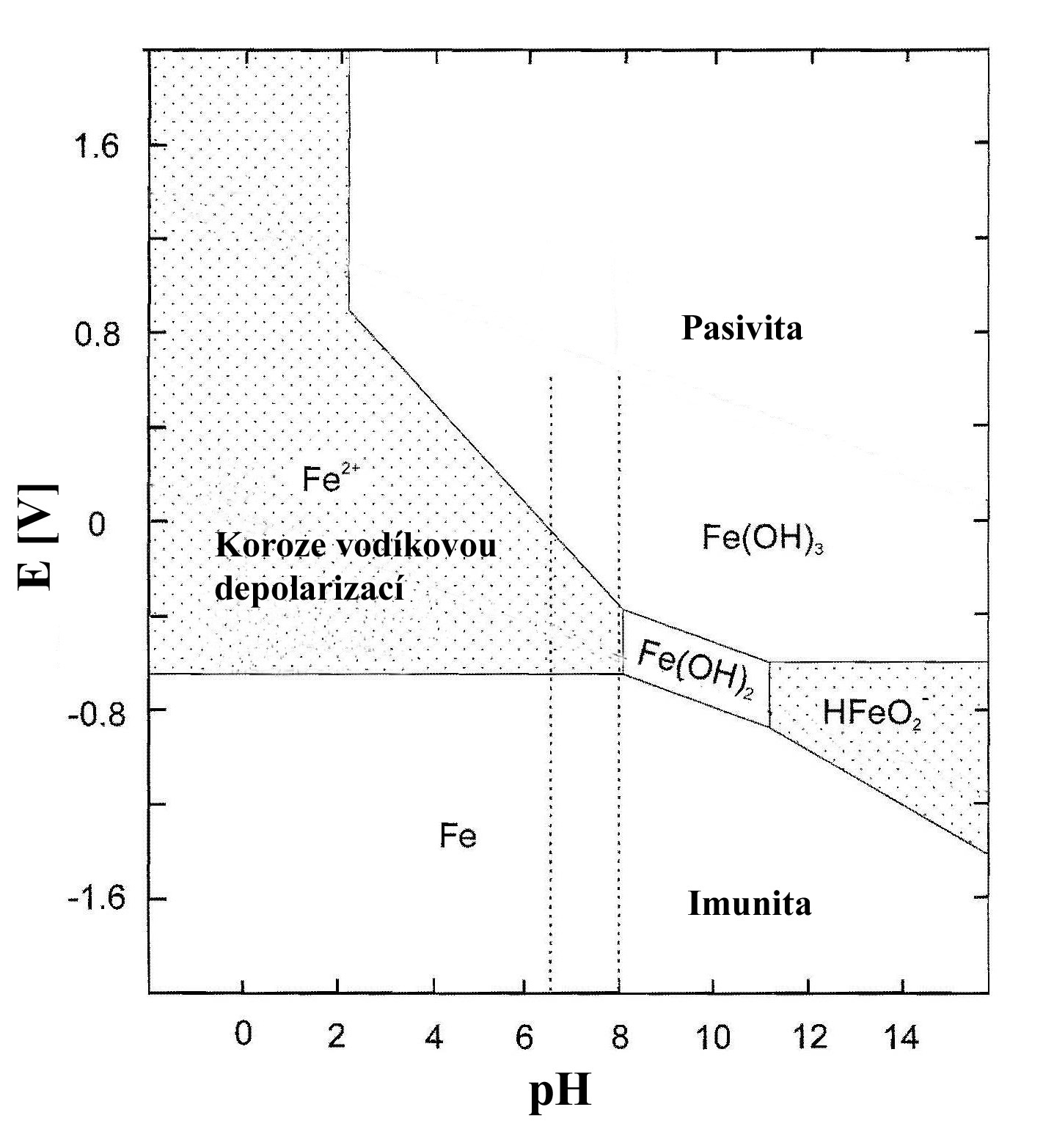 Pourbaixův diagram pro Fe na obr. 1 ukazuje, že železo může korodovat v širokém spektru pH. Při vyšších hodnotách E se vytváří pasivní vrstva Fe2O3, Fe3O4, resp. Fe(OH)2.