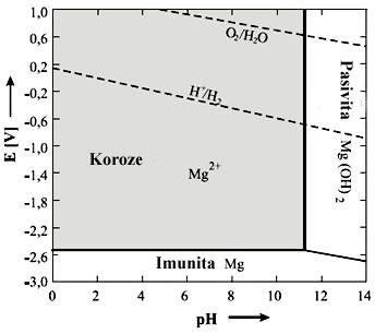 Zjednodušený Pourbaixův diagram pro Mg je znázorněn na obr. 2. Z diagramu plyne, že při pH mezi 0 až 11 dochází k aktivnímu rozpouštění Mg, zatímco při pH větším než 11 je chráněn stabilní pasivní vrstvou Mg(OH)2. Na rozdíl od hliníku vytváří hořčík stabilní pasivní vrstvy ve vodném roztoku bez účasti dalších iontů. Podmínkou je pouze pH vyšší než 11. Oblast imunity existuje kvůli výrazně negativnímu standardnímu potenciálu Mg pouze pod hodnotou -2,5 V.