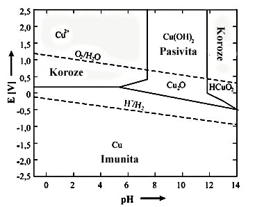 Z Pourbaioůva diagramu pro Cu na obr. 3 je zřejmé, že měď se dokáže pasivovat v neutrálních i ve slabě zásaditých prostředích a v kyselinách dochází ke korozi. Výrazná oblast imunity souvisí s ušlechtilostí mědi (standardní potenciál je + 0,35 V).