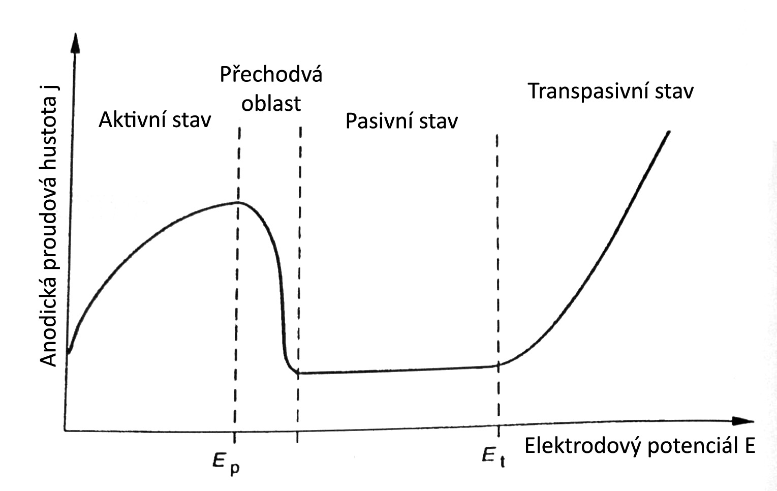 Schematickou polarizační křivku znázorňuje obr. 4. V oblasti aktivního stavu se kov vyskytuje bez přítomnosti tuhých korozních produktů. Po dosažení hodnoty Ep (v závěru přechodové oblasti) dosahuje kov plné pasivity a u některých pasivovatelných kovů může docházet ke snížení korozní rychlosti tak, že prakticky odpovídá úplné odolnosti kovu. K přechodu kovu z aktivního do pasivního stavu je třeba překonat kritickou pasivační proudovou hustotu, která odpovídá hodnotě při dosažení Ep. Čím je její hodnota menší, tím snáze kov do pasivního stavu přechází. U slitin se tato hodnota snižuje přísadou dobře pasivovatelných kovů, tj. u korozivzdorných ocelí především chrom nad 12%, dále pak molybden a nikl. Využitelnou oblastí pasivity se vyznačují jen některé kovy např. chrom, hliník, titan, zirkonium a hořčík. Pasivní vrstvy těchto kovů mají nečastěji oxidický charakter, mohou však vznikat i vrstvy solné. Jiné kovy jsou pasivní jen v omezené oblasti pH. Odolnost kovu v pasivním stavu především závisí na rychlosti rozrušování pasivní vrstvy v daném prostředí a podmínkách. Při dalším růstu potenciálu a překročením hodnoty Et dochází ke korozi v transpasivním stavu.