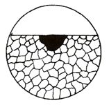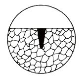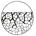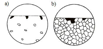 Obr. 9 Schéma selektivní koroze; a) napadena jedna fáze více fázové struktury, b) napadení jednotlivých zrn struktury