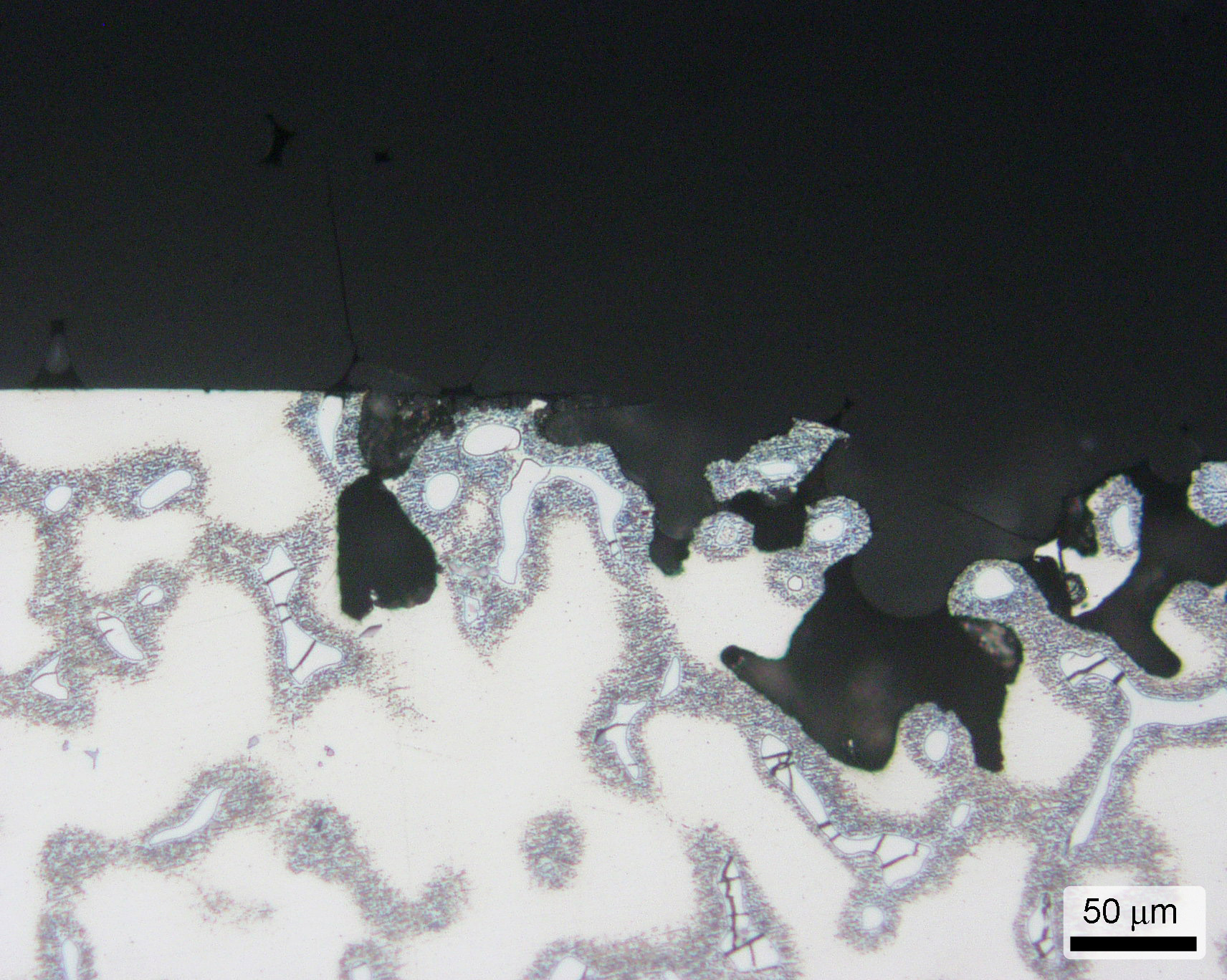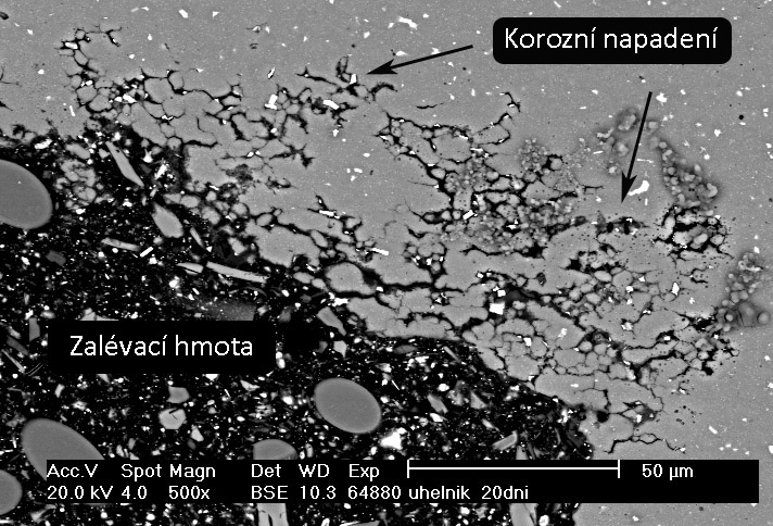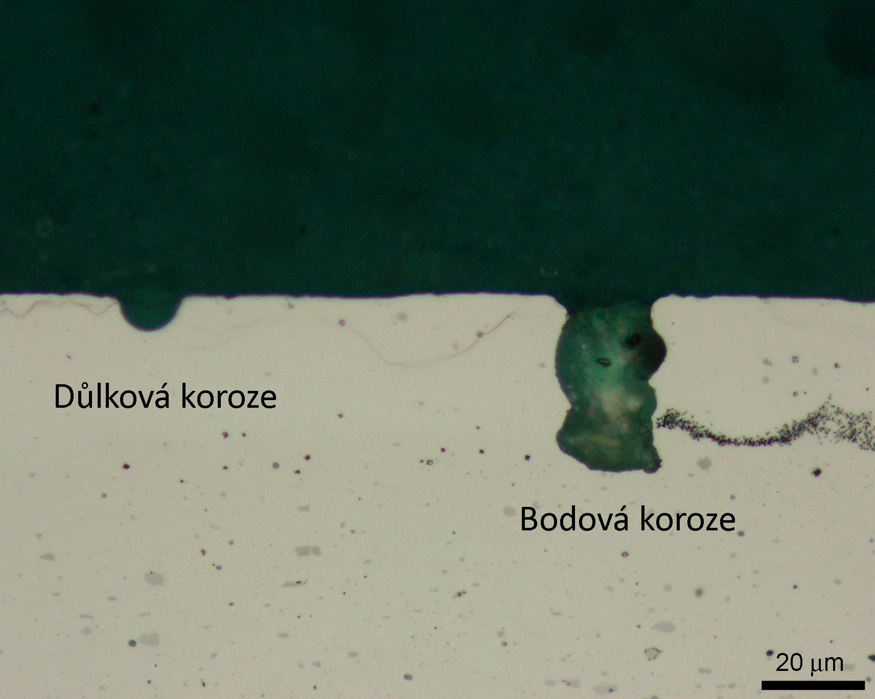 Příklad napadení hořčíkové slitiny AZ91 po expozici v korozní komoře v prostředí solné mlhy je zobrazen na snímku ze světelného mikroskopu na obr. 10.